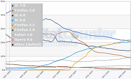 Według danych serwisu analitycznego StatCounter, przeglądarka Firefox 3.5 wyprzedziła o niespełna 1 proc. zasięgu program Internet Explorer 7 i stała się po raz pierwszy w historii najpopularniejszym programem do przeglądania sieci.