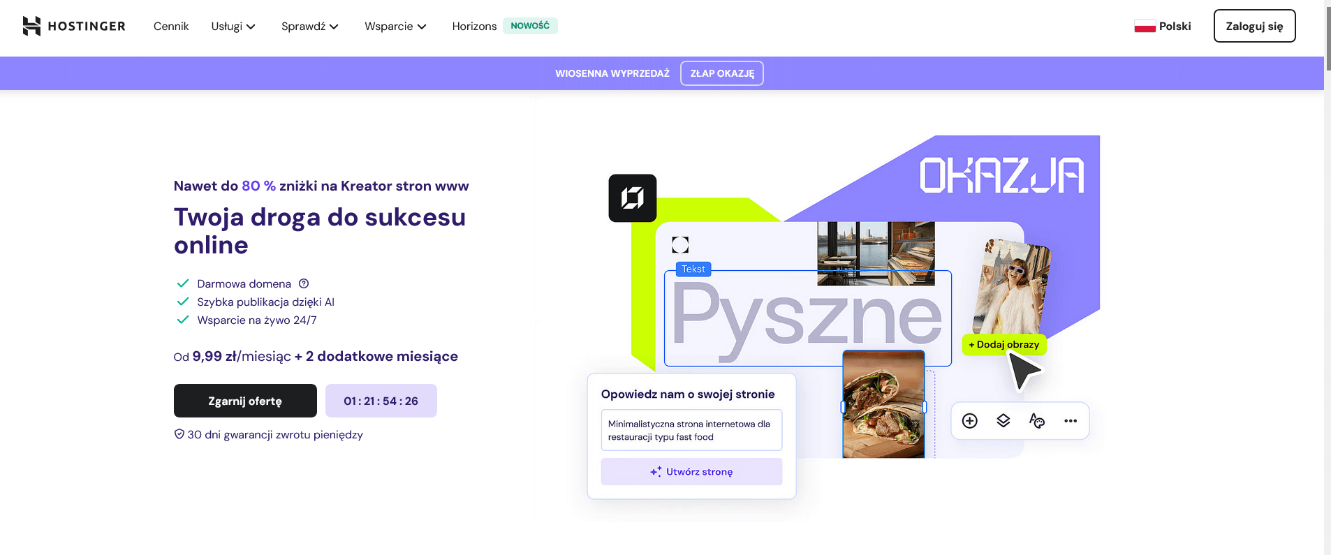 | Hostinger | Reklamy, branding platformy, ograniczone opcje personalizacji | 150+ | 4.5/5 | Dobre opcje e-commerce | Małych firm |