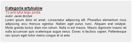 [..]<body> <div id="wrapper"> <h2>Kategoria artykułów</h2> <strong>To jest tytuł tego posta.</strong> <em>: Jan Kowalski</em> <p>Lorem ipsum dolor sit amet, consectetur adipiscing elit. Phasellus elementum risus adipiscing arcu rhoncus egestas. Nullam eget purus nunc. Aliquam erat volutpat. Morbi gravida luctus diam non rutrum. Nulla in est mauris. Mauris dignissim mauris vel nulla accumsan quis scelerisque augue varius. Donec in facilisis sapien. Pellentesque nec ipsum eget tortor viverra congue et id ante.</p> </div></body></html>