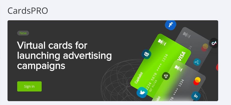Platforma Capitalist oferuje wirtualne karty pod marką CardsPro z myślą o płatnościach reklamowych. Są to karty Visa i Mastercard powiązane z bankami z USA, Europy i Wielkiej Brytanii. Nie są przypisane do jednej platformy reklamowej – należy samodzielnie dobrać odpowiednią. Rejestracja wymaga dodatkowej weryfikacji oraz krótkiego wywiadu z menedżerem.