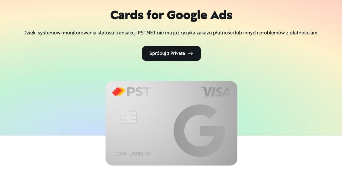 Wirtualne karty oferowane przez PSTNET zostały stworzone specjalnie z myślą o platformach reklamowych. Serwis zapewnia jedne z najlepszych kart kredytowych do Google Ads z cashbackiem 3%. Karty można emitować w ramach programu PST Private, a także jako oddzielne karty przeznaczone wyłącznie do Google Ads.